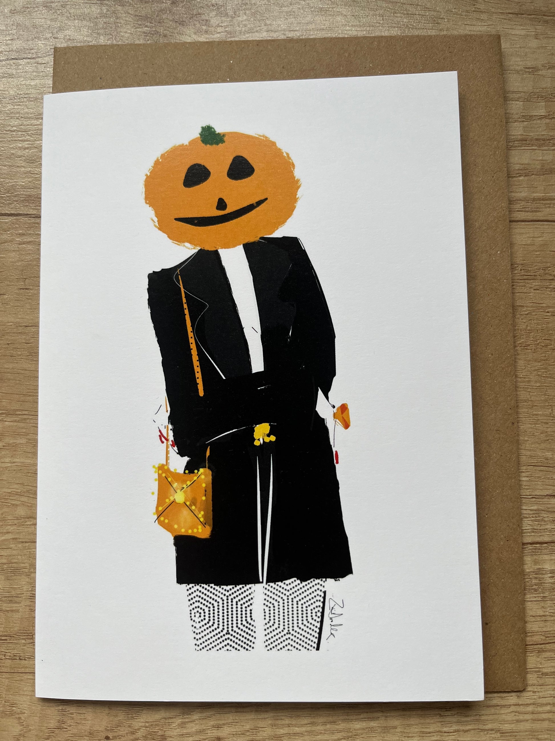 Halloween, but make it fashion. Who says spooky can’t be stylish? This chic pumpkin-headed fashionista serves autumn attitude with designer vibes and a sprinkle of humour. Perfect for Halloween greetings, autumn birthdays, or sending cosy seasonal love — pumpkin spice latte not included (but encouraged).