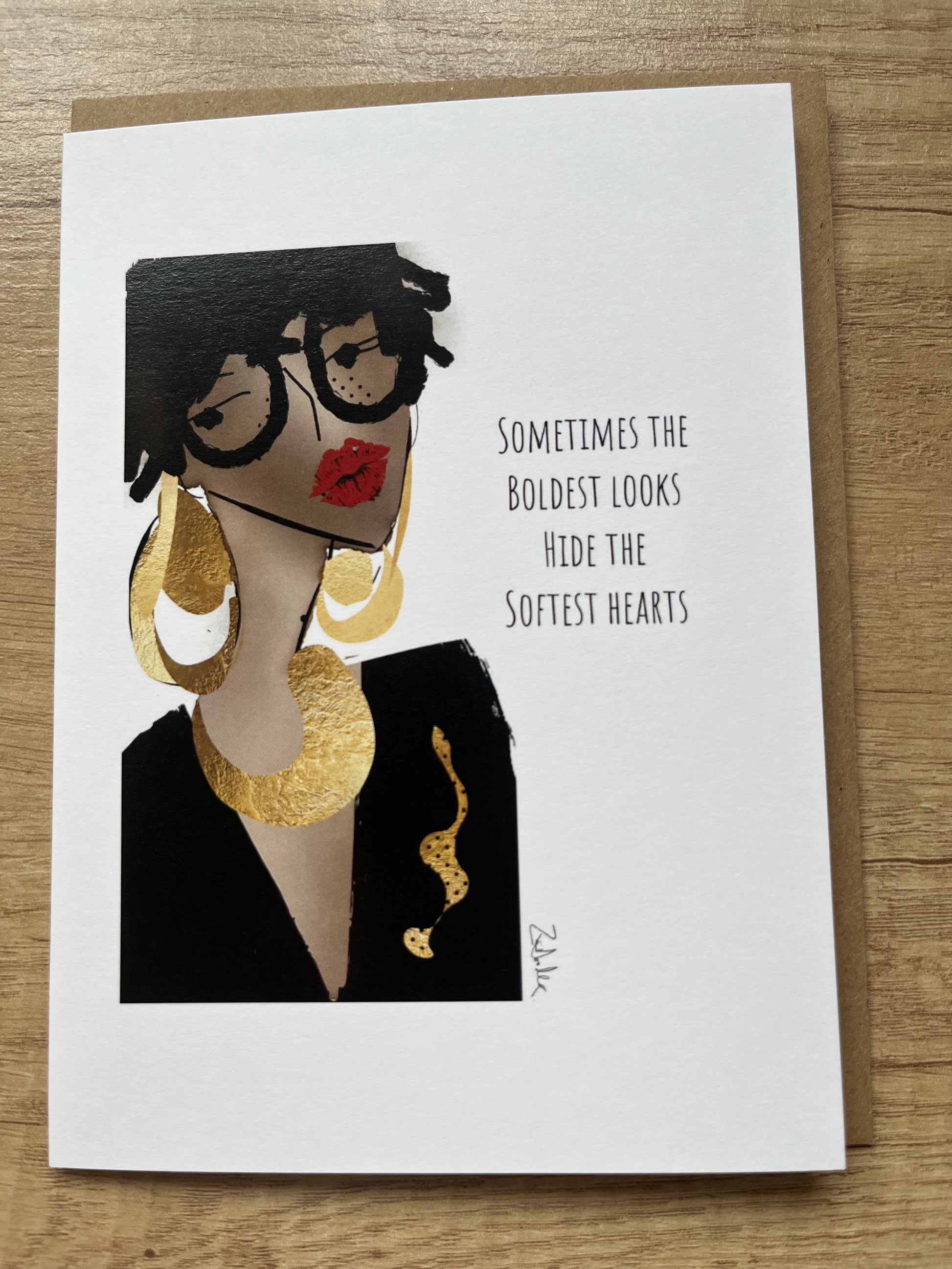 Fierce face, golden heart. For the friend who wears confidence like couture — but loves fiercely underneath it all. With oversized glasses, statement gold jewellery and soft sentiment, this card is equal parts power and tenderness.